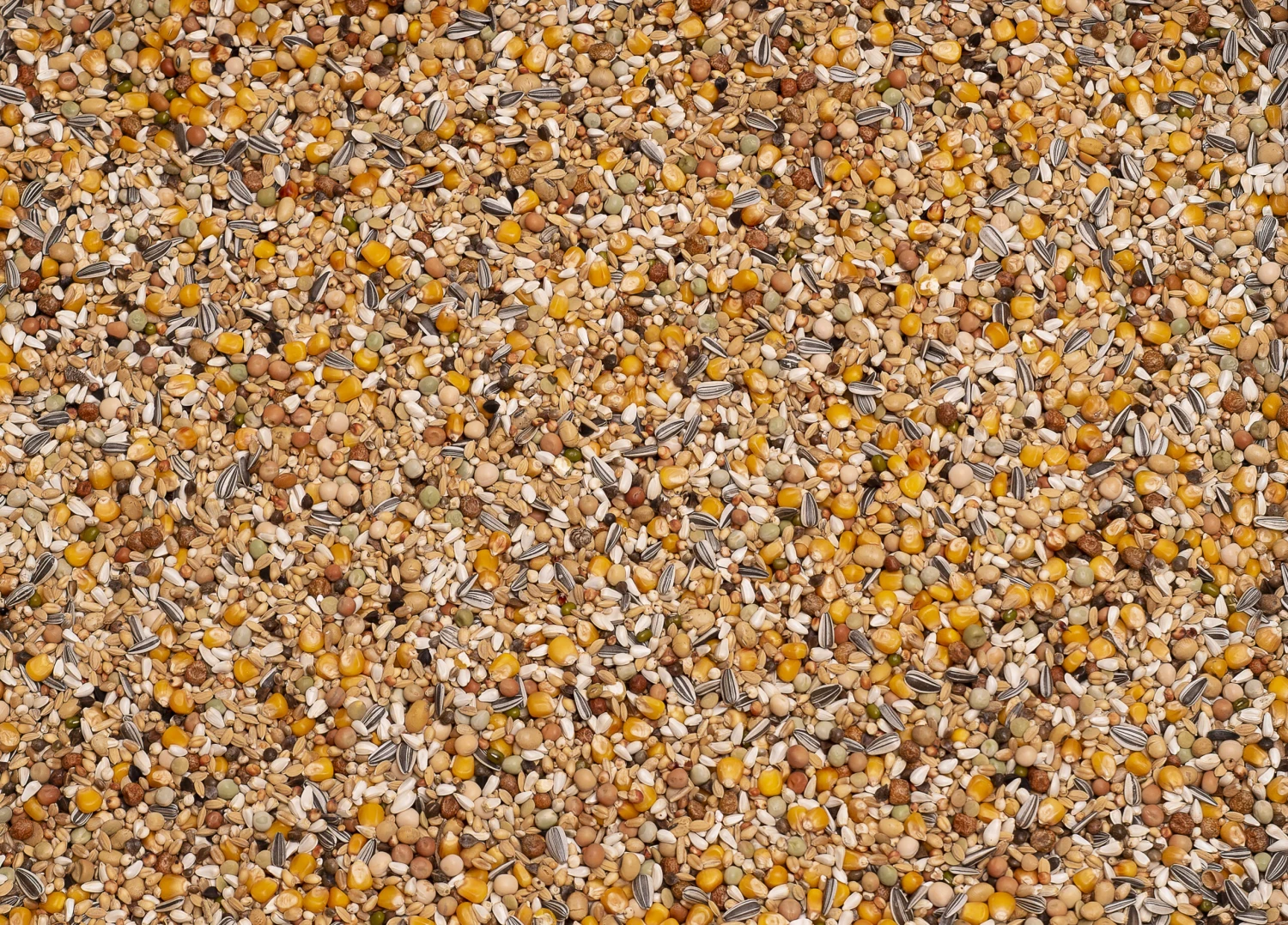 Cribbs-Mais 18%, weiβer Weizen 14%, Kardi 10%, Paddy-Reis 8%, getoastete Soja 5%, rote Sorghum 5%, weiβer Dari 5%, Dunpeas 4%, grüne Erbsen 4%, Maple Peas 4%, gelbe Erbsen 3%, Buchweizen 2,5%, geschälter Hafer 2,5%, gestreifte Sonnenblumenkerne 2,5%, Linsen 2,5%, Plata-Hirse 2,5%, Wicken 2,5%, Hanf 2%, Sesam 2%, Katjang Idjoee 1%